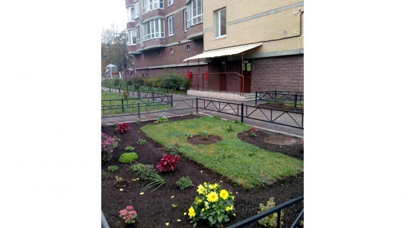 В комплексе были заменены подъёмно-секционные ворота в паркинге и входные группы, а также проведены работы по восстановлению наклонного входа. Кроме того, мы покрасили малые архитектурные формы, поручни и все металлические двери технических помещений по фасаду. Вместе с инициативной собственницей была благоустроена территория дома
